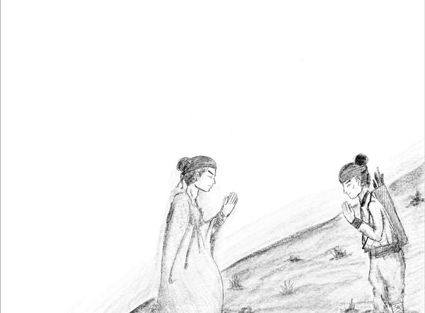 Tay anh thoăn thoắt lấy lá thuốc trong túi ra, rồi đắp lên vết thương. Lộc cảm thấy vết thương lạnh buốt rồi từ từ không nhức nhối nữa. Bây giờ anh mới để ý, người thanh niên trước mặt anh trông không có vẻ gì là một thầy tu, nhưng anh ta lại quấn một mảnh vải lớn khắp người. Và thật lạ, nó hình như đổi màu liên tục dưới ánh nắng của tiết tháng giêng. Chắc là Lộc bị hoa mắt. Cuối cùng, người thanh niên xé một miếng vải nhỏ, rồi bó cái chân của Lộc lại.